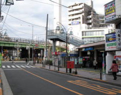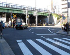 踏切を渡り、山手通りの緑色のガード