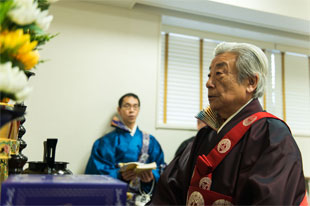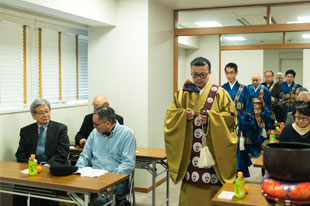 樹谷住職の調声のもと三奉請(さんぶじょう)を、引き続き参加者全員で正信偈をお勤めいたしました。最後に住職が御文章(ごぶんしょう)・信心獲得の章を拝読し、一人ずつ焼香しました。